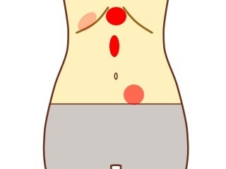 腹診を行なうと、左下腹部に血液の滞り(おけつ)と、胃のツボに反応がある。