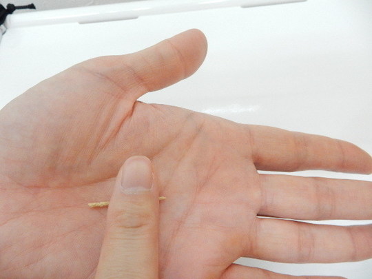 そうしましたら、軽く指でもぐさを前後に転がして下さい。この際、強い圧力がかからないようにご注意ください。(強い圧が加わると、糸状になりません×)