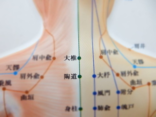 後頚部・肩上部・肩背部などを通る経絡(気・血の通り道)が交わる所なので、大椎に『はり』や『お灸』をすると、気血の流れが良くなり筋肉のこわばりを緩める作用があります。