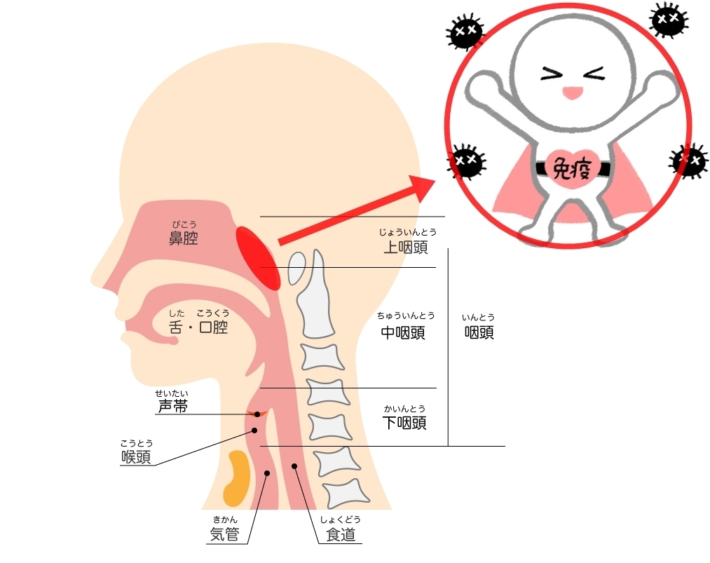 鼻の奥にある上咽頭では、体内に侵入する異物を排除する免疫機能があります。