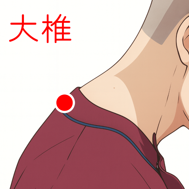 大椎は、首の根元にあります。頭を前に倒した時に一番出っ張っている骨の棘突起の下にあります。