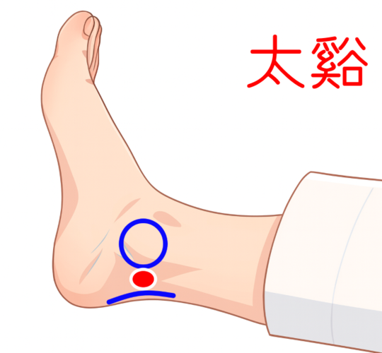 太谿は、内くるぶしのアキレス腱の間の凹みにあります。