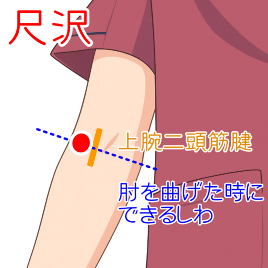 手のひらを正面に向け肘を伸ばします。肘を曲げ伸ばしした際にできる皺(しわ)の上にあり、上腕二頭筋と呼ばれる力こぶの腱の外側にあります。