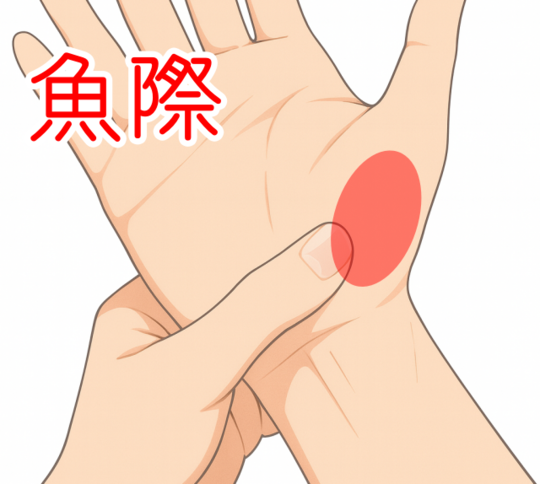 魚際は、手の太陰肺経と呼ばれる経絡上にあるので、肺(呼吸器)と関わりの深いツボです。