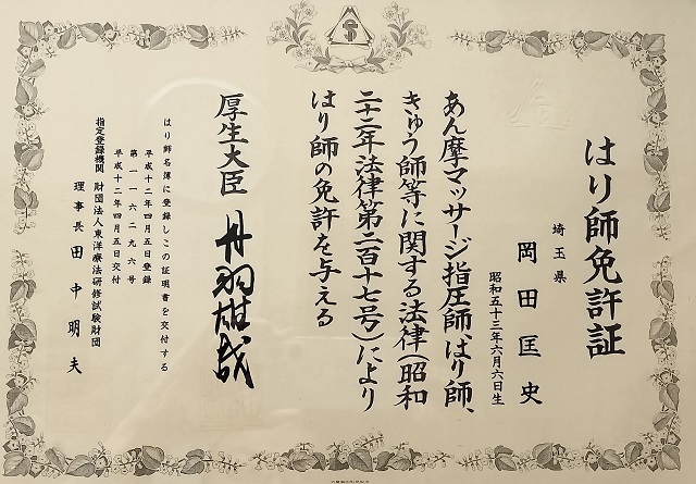 平成12年に「はり師」・「きゅう師」・「あん摩マッサージ指圧師」の国家資格を取得し、施術歴25年になります。