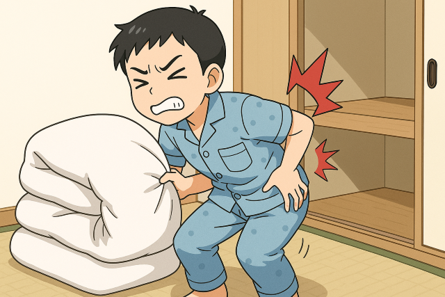 小学生の時の話になりますが、布団をたたんで押し入れに入れようと持ち上げた際に、「ギクッ」と、電気の走るような腰痛を起こした事があります。